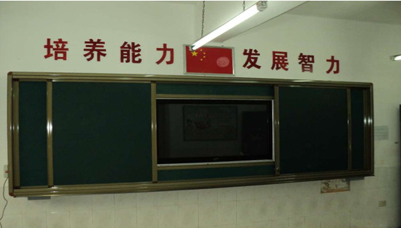 2. 外滑軌裝置:安裝兩塊移動(dòng)綠板,兩綠板尺寸之和與內(nèi)軌道白板的尺寸一致;進(jìn)行常規(guī)教學(xué)時(shí),可將此綠板滑動(dòng)到液晶電視前方,保護(hù)液晶觸摸一體機(jī),增大書寫面積;進(jìn)行多媒體教學(xué)時(shí),將綠板拉開,使用液晶觸摸一體機(jī)。